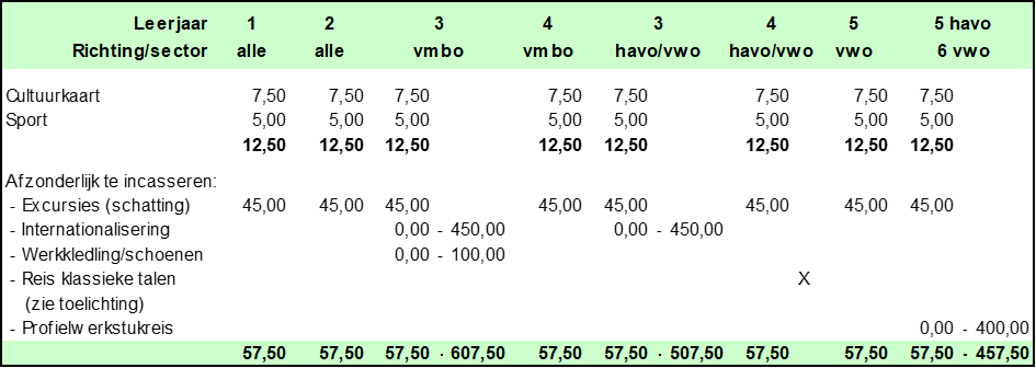 De kosten van excursies en andere culturele activiteiten worden afzonderlijk per activiteit doorberekend. Op basis van de gegevens van de laatste jaren verwachten wij dat de bijdrage jaarlijks maximaal € 40,- zal bedragen.